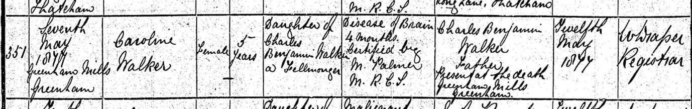 Caroline died on 7 May 1877 at Greenham Mills, aged 5, from a disease of the brain. Q2 1872 Newbury 2c 150.