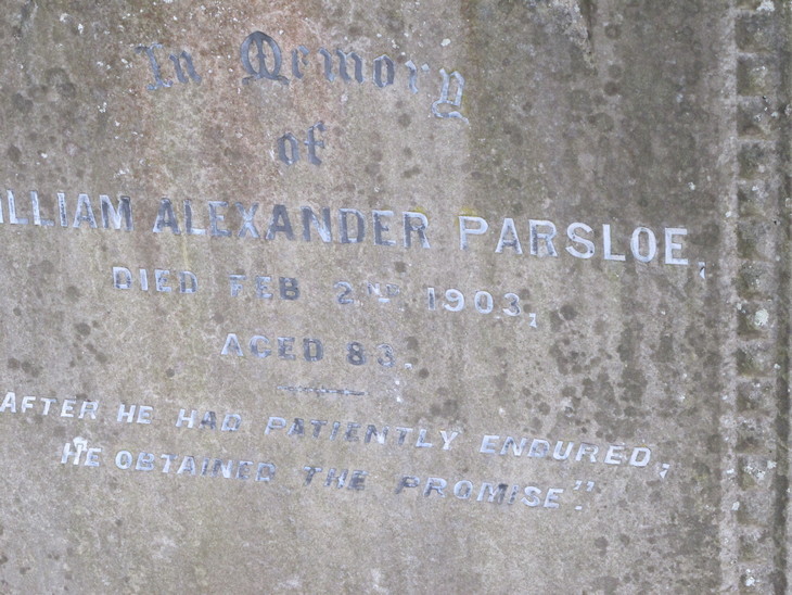 In Loving Memory Of (ILMO) William Alexander PARSLOE died Feb 2nd 1903 aged 83 "After he had patiently endured he obtained the promise". | |