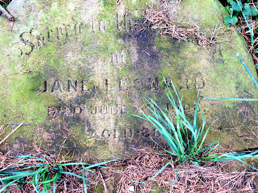 | Headstone: Sacred to the memory of/ Jane Leonard/ died June 5th 1908 aged 88/ "Father in thy gracious keeping/ Leave me now thy servant sleeping/ Footstone: 1908 | |